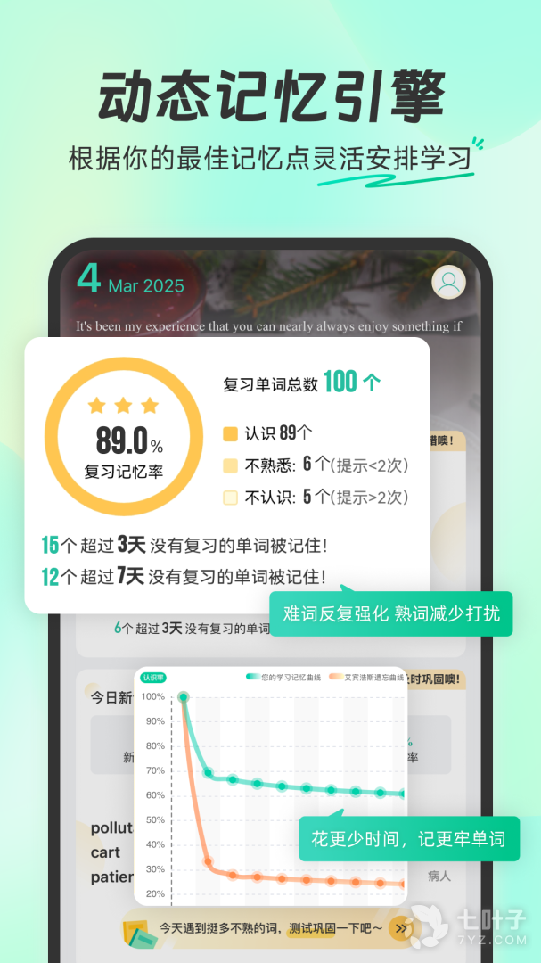 4、重新审视遗忘曲线,独创真题例句智能关联学习法,直击考点,背一个词,顶三个词