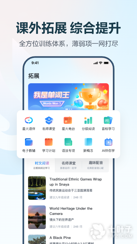 2、三段三步高效提分:匹配学校单元同步、阶段复习和寒暑巩固的教学频段,智能化支持自主学习(学)、作业训练学情分析(练)、错题订正巩固(订)的学习路径,有效提高听说成绩