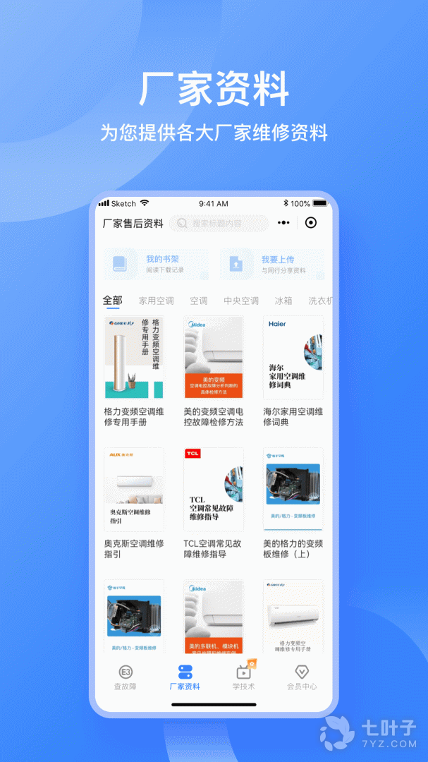 全面,专业,高效家电故障码查询工具,包含格力,美的,海尔,奥克斯,志高,格兰仕等品牌的故障码,以及上百份的家电维修资料。