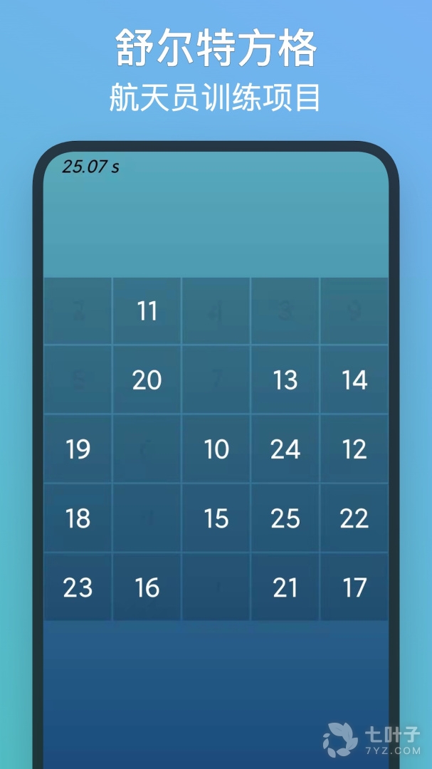 舒尔特方格 (Schulte Grid)是在一张方形卡片画上的25个方格,格子内任意填写上阿拉伯数字 1 ~ 25等共 25个数字.训练时,要求被测者用手指按 1 ~ 25的顺序依次指出其位置,同时诵读出声,数完 25个数字所用时间越短,注意力(专注力)水平越高.