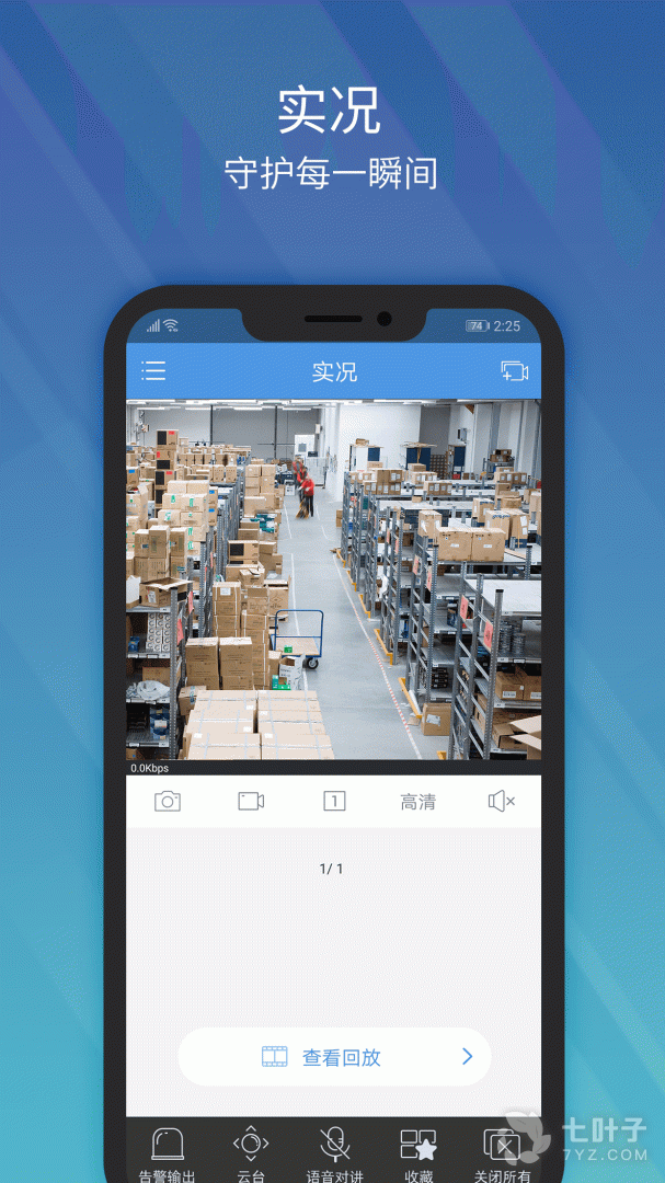 支持扫码快速添加设备、焦点窗格实况回放界面可切换、移动数据/Wi-Fi流量实时统计。