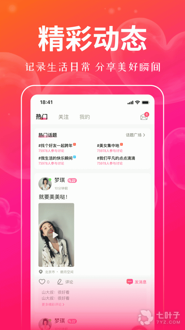 3、这款软件中有着很多的用户,每个用户都是经过实名认证的,大家可以放心交友,在这里交友模式很多,大家可以通过附近的人、漂流瓶、还有可以加入各种话题圈子找到兴趣相投的好友,是一款恋爱交友神器哦~