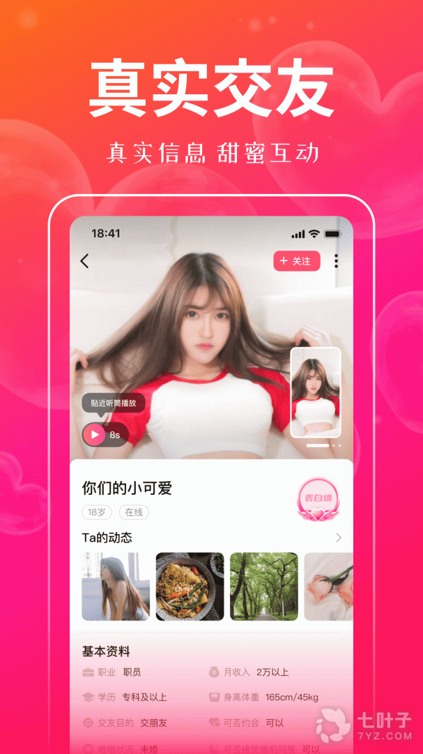 5、这款软件商拥有海量的优质单身青年,每位用户都是经过平台人脸识别安全认证,用户们可以放心的交友聊天,可以自由的视频,系统还会根据个人爱好,推荐相关的知心良友,一键邀请好友加入群聊一起游戏