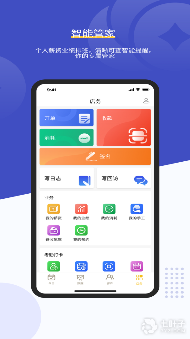 它是适合美业工作人中使用的应用APP。它是集个人排班、日常考勤、客户档案管理、工资统计、仓库盘点等日常美业工作于一体的管理软件。通过它,美业工作人员可实现手机打卡上下班,手机记录业绩变动,查看工资明细、客户档案,还可以通过手机进行产品培训,了解公司各项制度通告等。是一个多功能的美业员工操作平台。