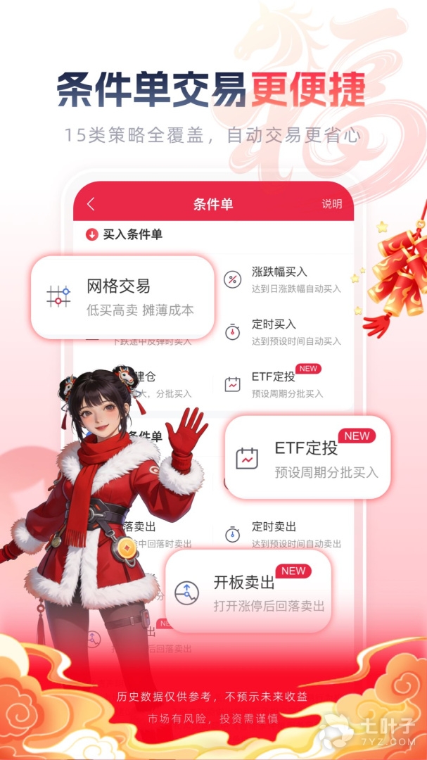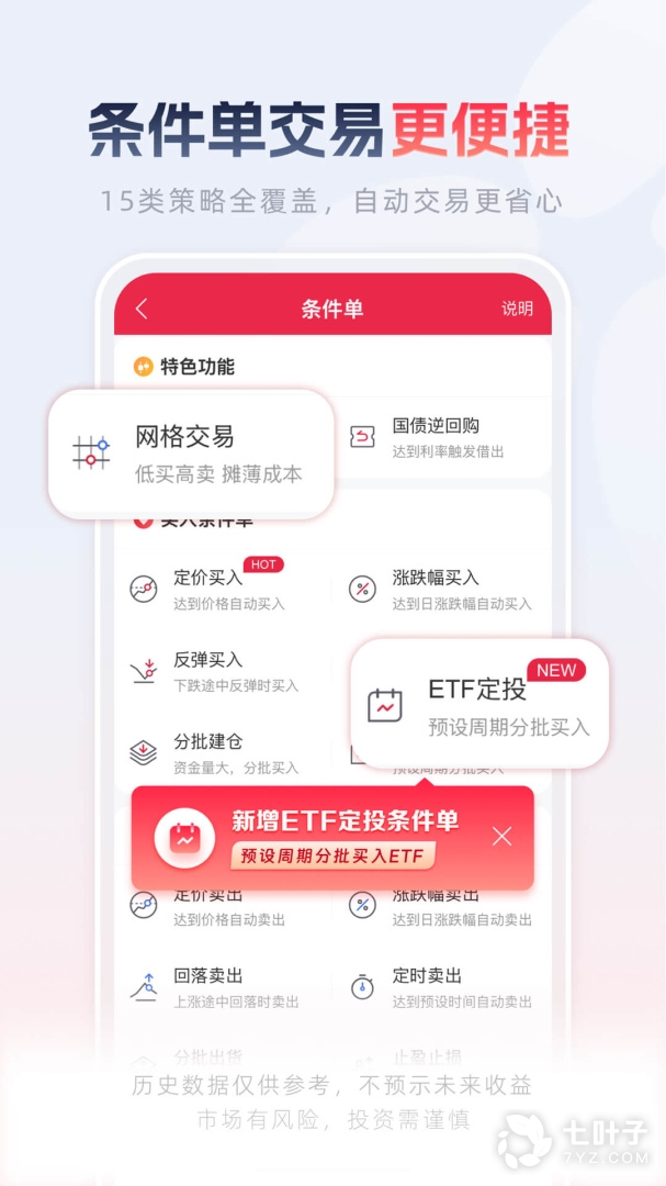 - 智能条件单:预约打新、多策略下单,让客户无论何时何地,都可以准确便捷的完成投资操作,从此交易不再受到时空的限制。