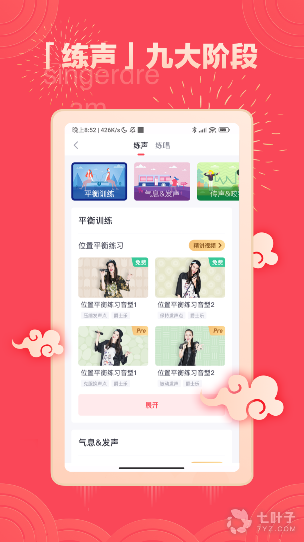 3、非凡的学唱歌体验,拥有实力派流行歌手的唱功就是如此的简单。海量流行声乐练习曲,每条练习都分为讲解示范、入门练习、进阶练习、达人练习,每条练声伴奏均经过精心编曲制作并由专业流行唱法大师完美示范。