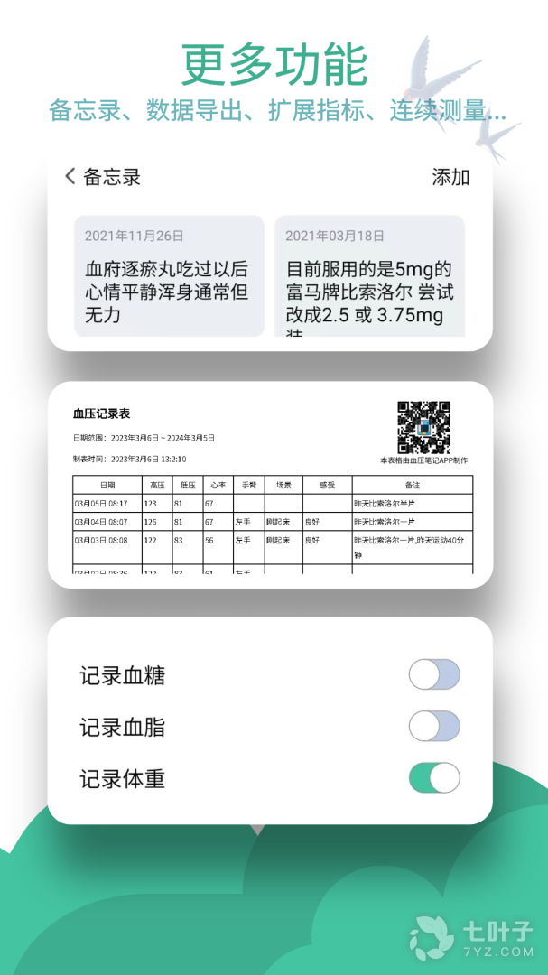 可记录在血压管理过程中用药体验、身体感受、主治大夫、体检报告、备忘录等信息。
