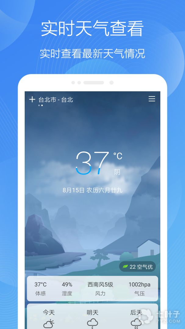 3、页面布局清新简单,但是功能强大,可以随时查看7天以内的天气预报,不止天气情况,还有空气的质量、红外线紫外线强度、当天的体感温度、穿衣建议等,为你的出行提前做好准备。你可以任意查询各个城市的天气,已覆盖了全国几千个城市,特别适合旅行或者经常出差的人使用