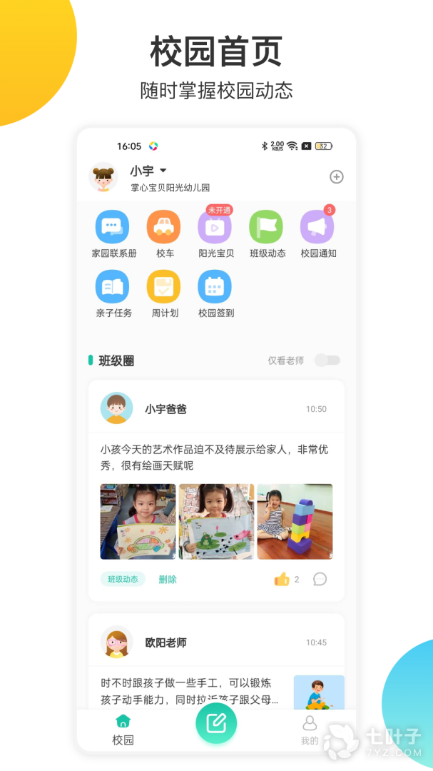 1、打造最具前瞻性的家校服务平台,让孩子们能在家校共同的努力下健康成长,今天为大家带来掌心宝贝,这是一款致力于架构家校沟通桥梁的服务软件,用户可以通过软件实时了解还在在校的学习情况,老师和家长们能更好的透过软件进行交流