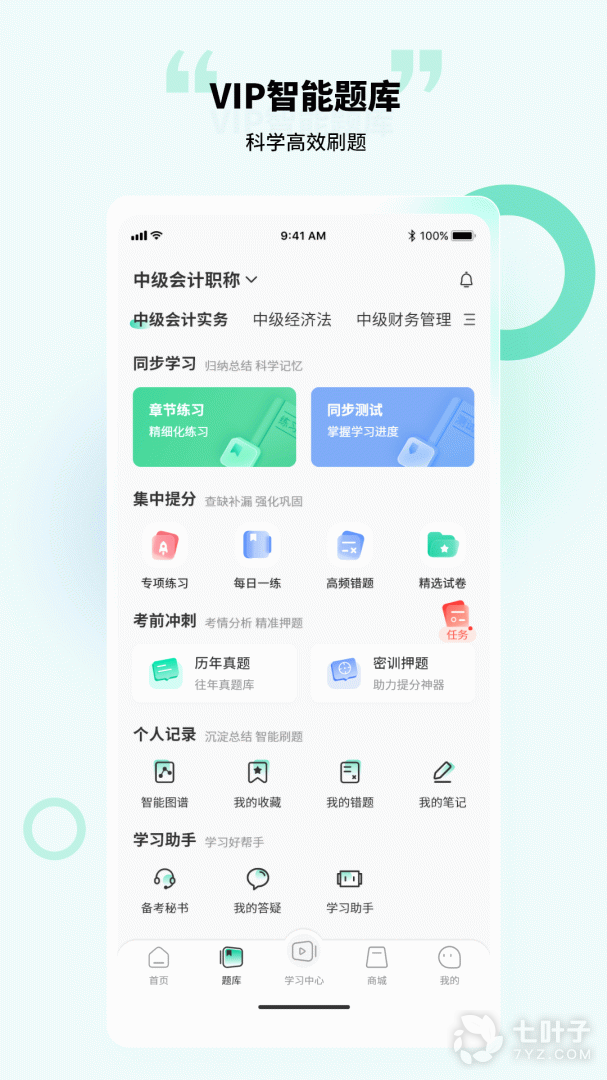 3、来到题库,这里可以进行章节练习、模拟测试,也可以查看错题收藏、学习笔记、我的答疑以及考试倒计时
