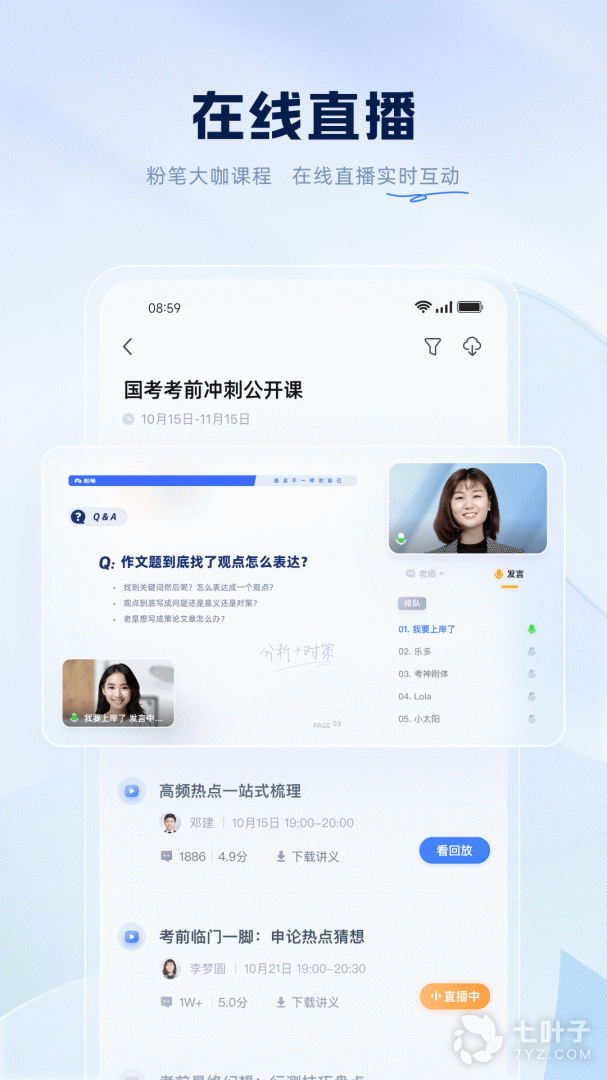 5 在线直播课:全国名师直播课程,可实时参与互动,体验真实上课场景,课程无限次回放。