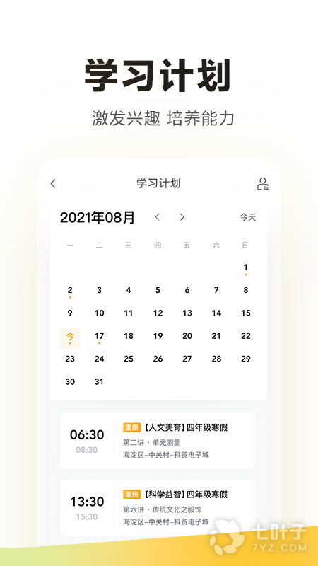 1、可以进入课程表板块,查看孩子的课程培训内容,方便安排和规划