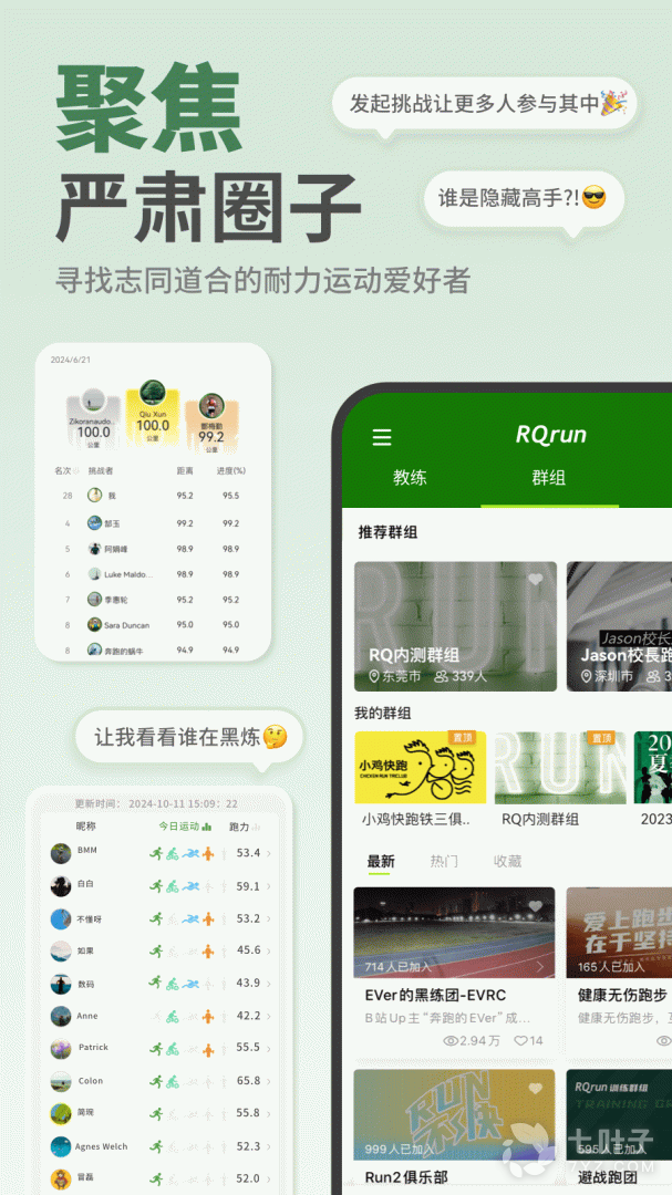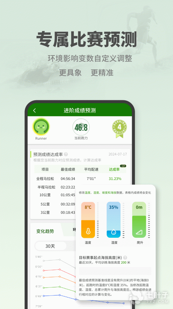 3、跑者:最新动态显示最近一笔跑步记录并自动生成水印图。此外,由跑者过往记录计算撷取出各种距离的最佳记录