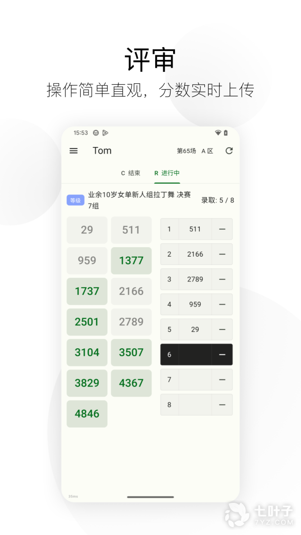 1、精雀赛事,舞蹈赛事专业计分打分的软件,主要还是评审以及主办方这些专业的老师以及后台工作人员使用的,实时记录目前正在进行的赛事,之后查看自己的分数数据,看看自己的打分,有一个初始的记录和音响,方便做好比较以及后续的打分