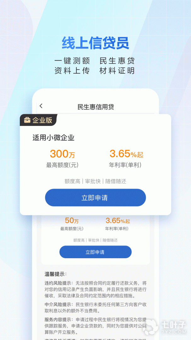 民生小微App是民生银行围绕小微客群特点打造的一站式服务平台,以拓宽小微客户融资渠道为初衷,提供各类常用金融及非金融服务功能,汇集流水贷、云企贷、光伏贷等创新贷款产品,引入民生线下专属服务经理满足客户特色金融服务需求,力图打造小微金融领域标杆应用,以客户为中心实现小微业务一站式办理。