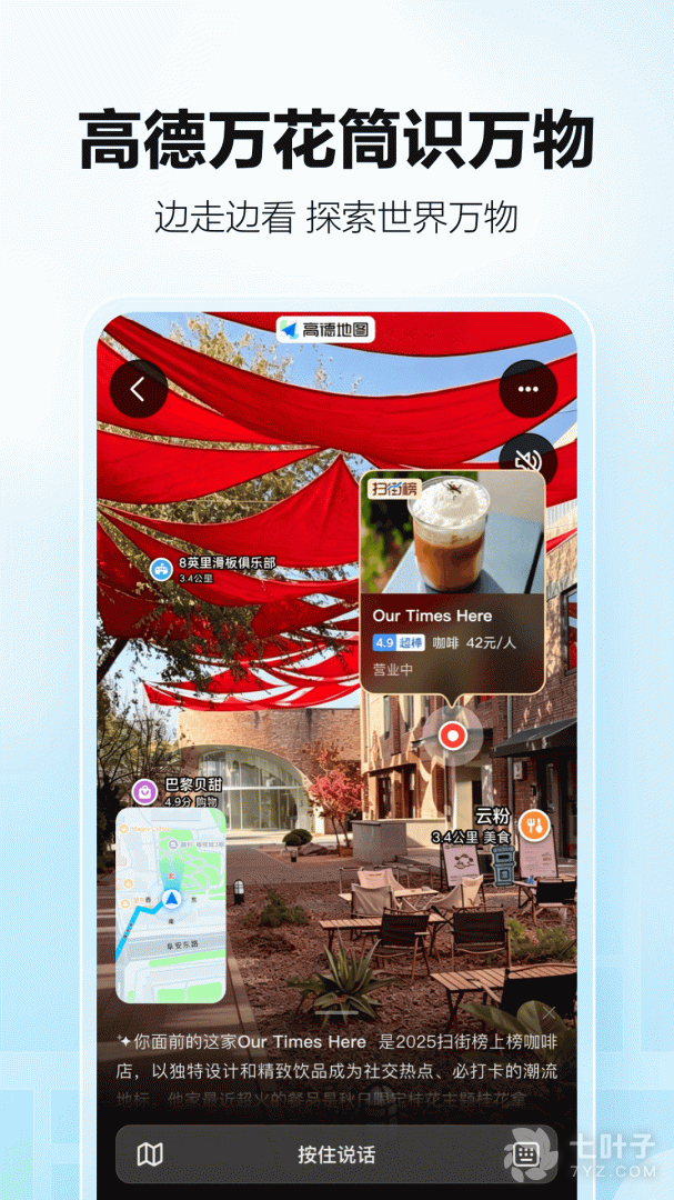 5、高德地图上线了最新AR实景步行导航功能,让你可以更加清晰的了解街道周围的建筑和店铺,每个店铺点进去都会有清晰的店内画面和用户的评价感受,让你不用进入这些店铺就能够了解到它们的优缺点,为你步行逛街提供了很好的参考