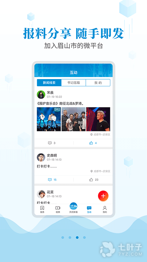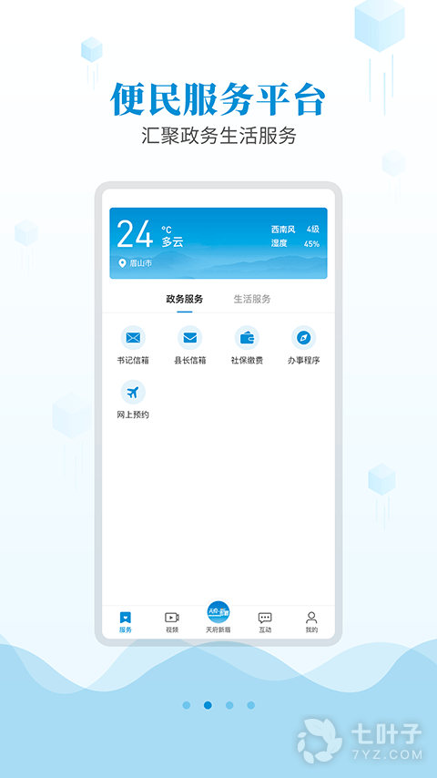 3、天府新眉是专为四川省天府新区眉山片区地推出的综合服务平台,为用户实时推送最新热点资讯,加入眉山市微平台,即拍即发,随手分享。还为广大市民提供了便民服务板块,包含了政务、生活相关服务