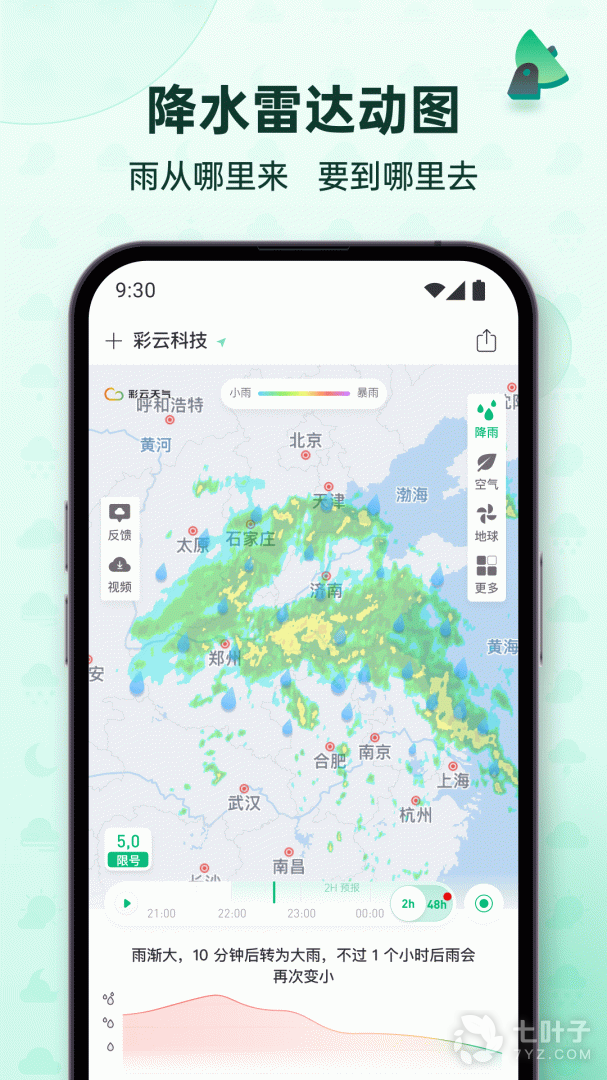 彩云天气是一款天气雷达类应用,中国大陆第一个可以预报几点几分下雨的应用。彩云天气可以精准到分钟级别,预测实时天气变化,堪称目前国内第一款实时降雨雷达应用。用户们可以知道几点几分会下雨,雨下得多大