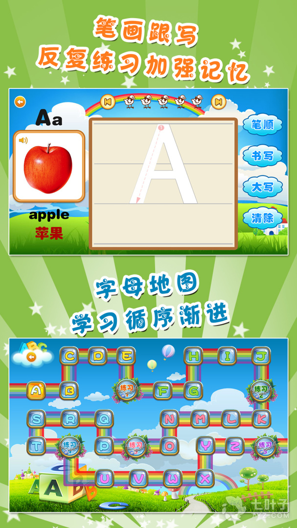 26个英文字母,进行笔顺动画演示和整字母练习等,帮助孩子实现书写规范,实现手脑并用能力的提升。