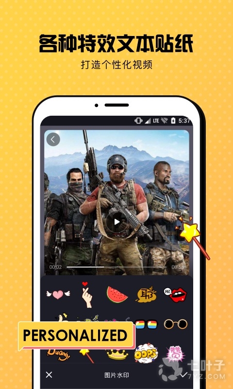 编辑特效:日系、复古、黑白、摩登、胶片等个性滤镜,动态文字、大片片头、趣味贴纸、真实音效素材。