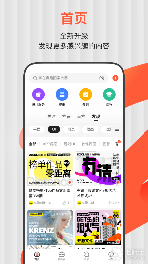 与平台同步更新首页展示的优秀设计\创意内容,实时查看好友动态如:发布新作、推荐以及评论。
