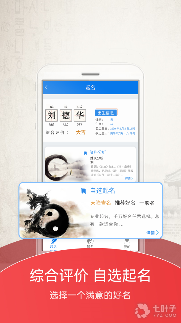 3.姓名评测,八字评测,汉字读音笔画五行属性查询,数理资料和三才资料阅览等功能。
