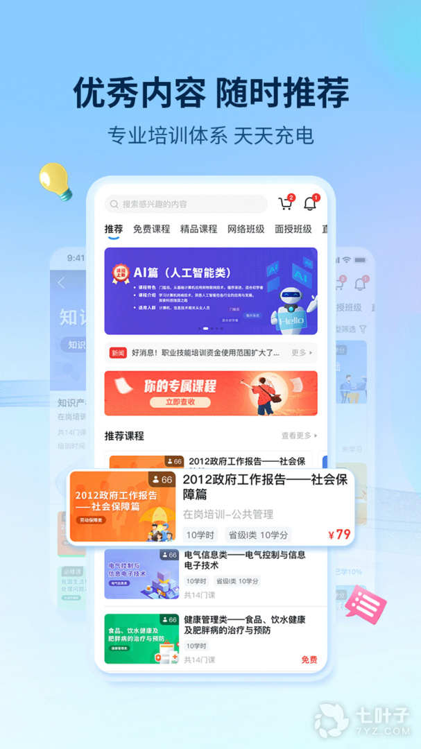 1.每天都要丰富的推荐课程,实时推送更多受欢迎的课程,线上学习专业知识;