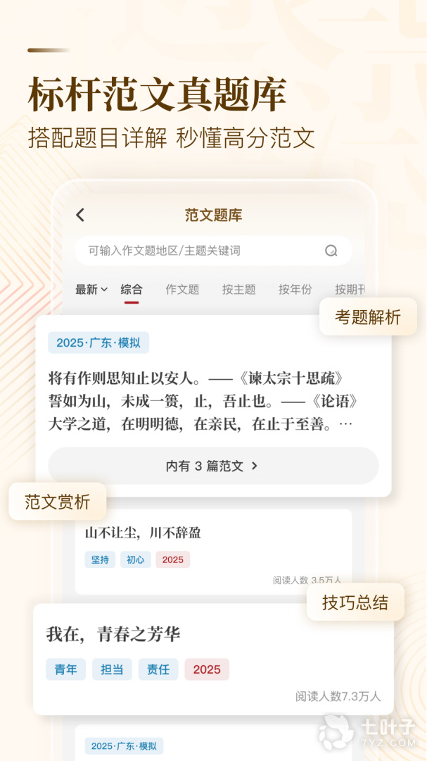 支持搜索全国各地的作文真题,配备优质范文与智能解析!