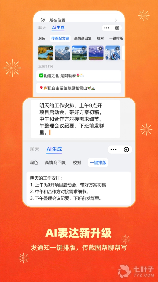 【AI表达升级】上传聊天截图帮你高情商回复;上传图片帮你生成朋友圈、评价、笔记文案。更能一键排版,让群信息发布得更有条理