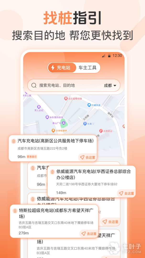 1、可以轻松帮你找到全国任何一个充电桩,支持周边搜索,地图拖动查找,关键字搜索等多种方式,找到充电桩以后,可以调起高德,百度地图直接导航到目的地