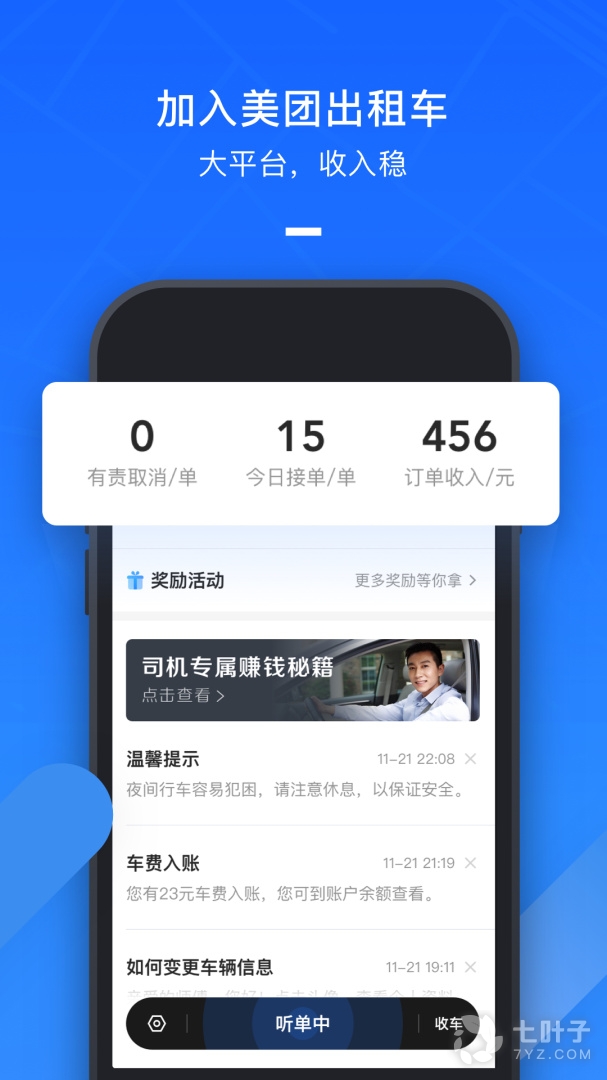 1、美团出租司机App是美团旗下为司机打造的接单平台,海量订单天天有,抢单系统与系统智能派单自由选择,接单后即可为与用户提供乘车服务赚取收益,App本身自带精确无比的地图导航功能,不论在什么时候都不会造成迷路的情况,是司机提高收入的好地方