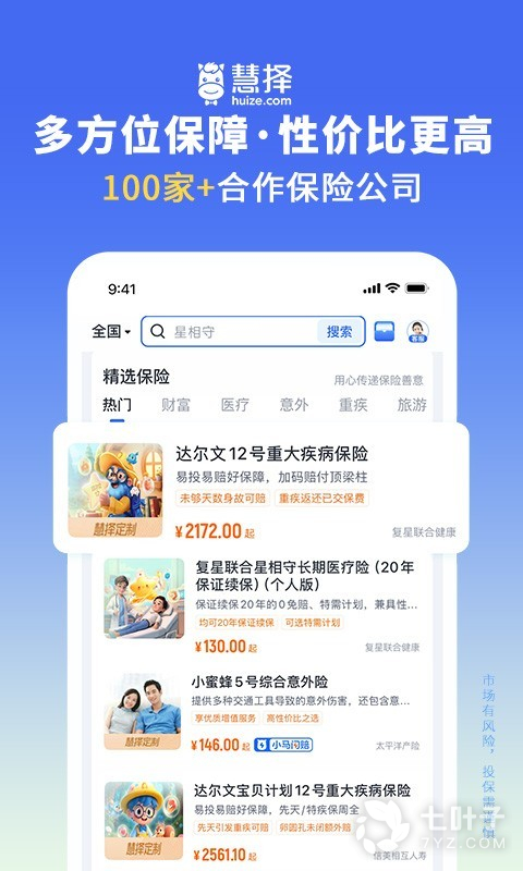 3、慧择保险网2024版帮你购买和选择保险,以及理赔相关服务的软件,慧择保险网为用户精选丰富的保险产品,险种多样,重疾、意外、教育、养老等等,轻松学习保险常识避开套路,专业客服团队全程为你服务,为你规划科学、合理的保险方案