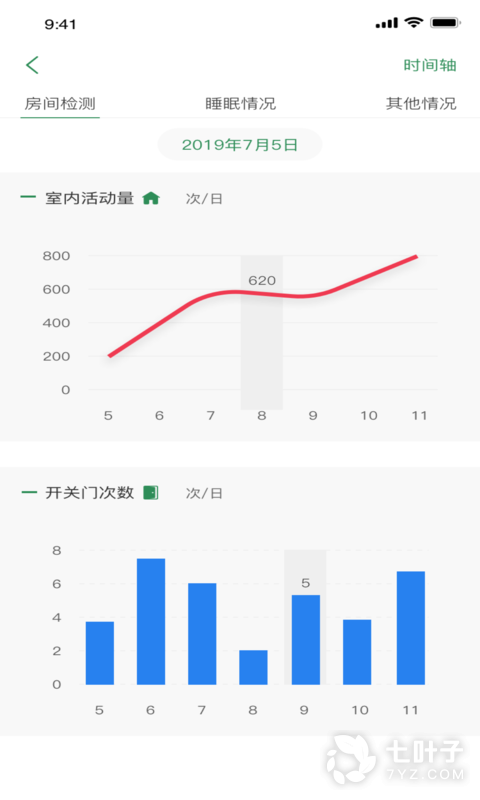 三大数据图表展示老人活动、睡眠以及其他主要情况;