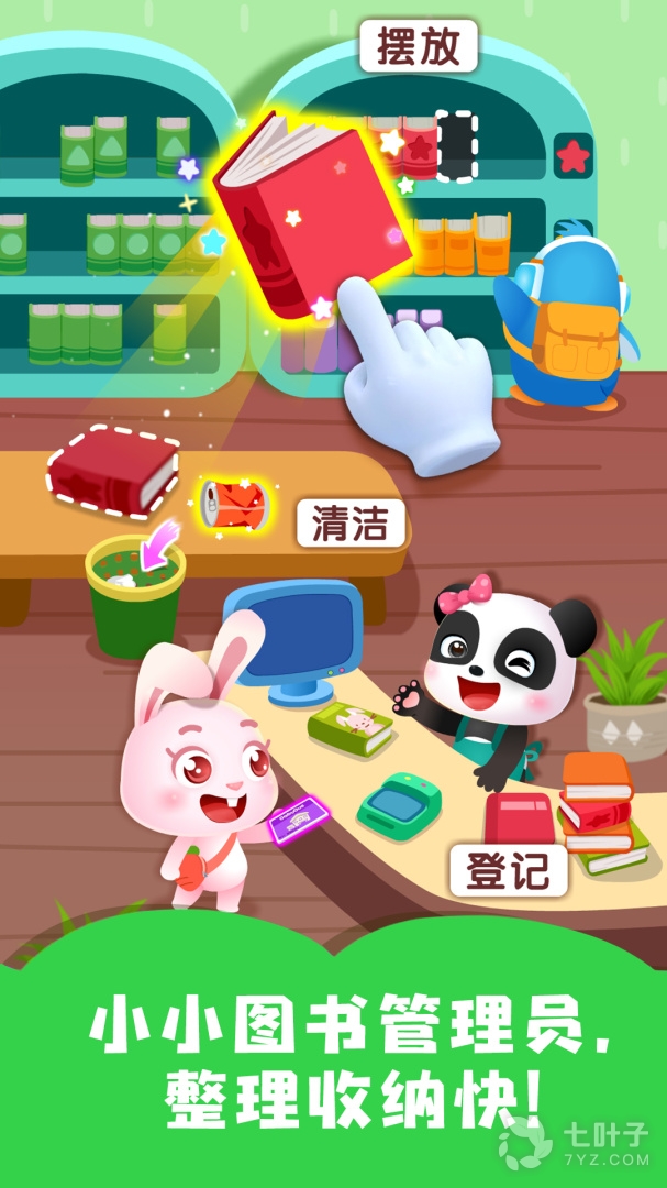 儿童根据顾客的年龄出售游泳馆门票,为顾客挑选泳衣。在图书馆为居民办理借书手续,分类收纳绘本和玩具(乐高、lego、积木),修补破损的故事、绘本、panda图书,把书籍放回书架......(幼儿早教,学习配对和分类)