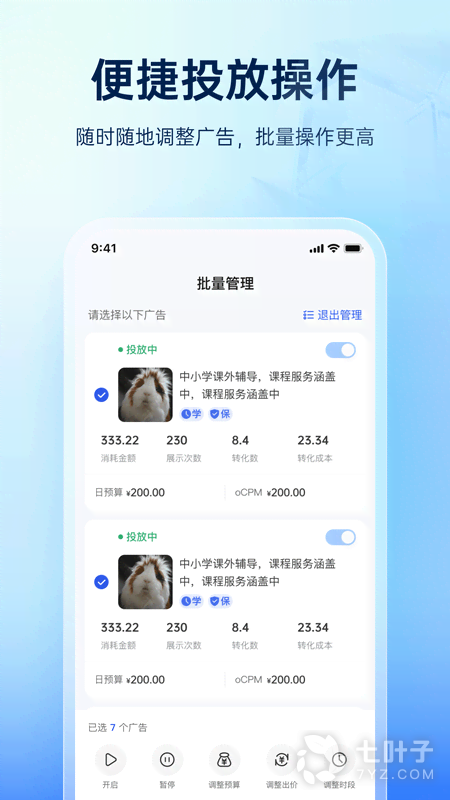 2. 推广管理:轻松管理广告组、广告计划、广告创意,查看投放数据、修改出价和预算、暂停和开启投放。没有电脑在身边,也可以及时调整广告投放状态;