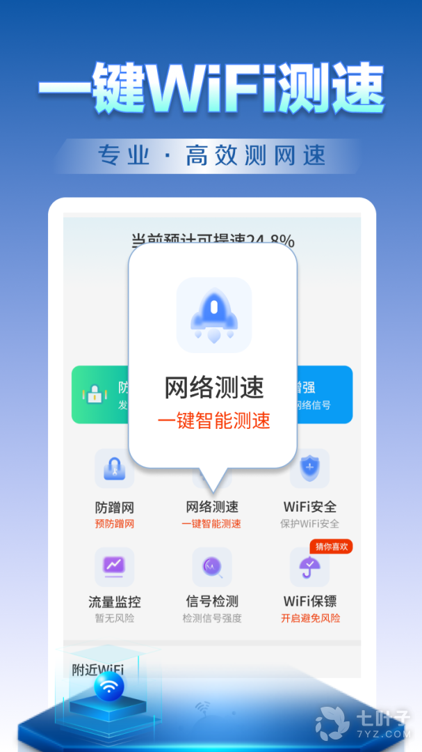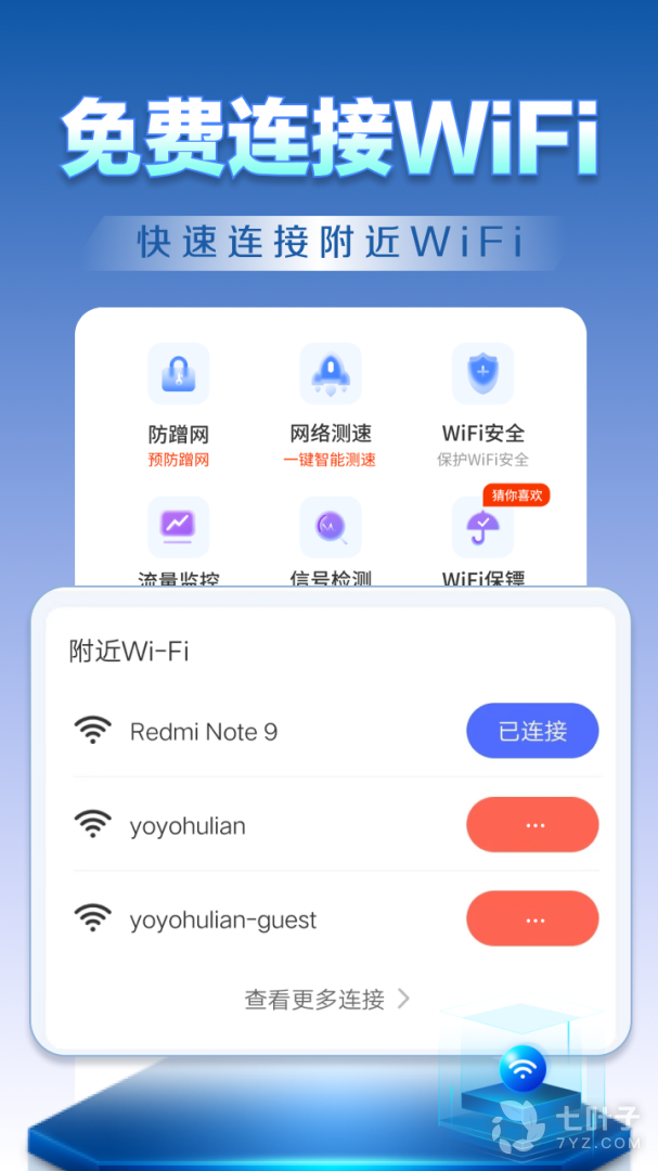 网络管理功能:WiFi钥匙天天连app不仅提供连接服务,还具备网络管理功能。用户可以通过该app查看当前连接的网络信息,包括网络速度、信号强度等。此外,它还提供了一些网络优化设置选项,如智能提速、设备检测等,帮助用户更好地管理和优化网络连接。