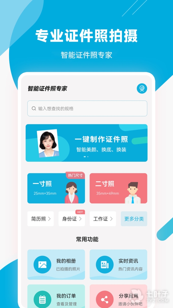 2、智能证件照专家拥有丰富的功能,它支持一寸、二存等不同规格的尺寸,同时还有入职照、证件照、证书照等固定尺寸模板,另外软件还可以更换底色,一张照片可以生成不同底色的证件照