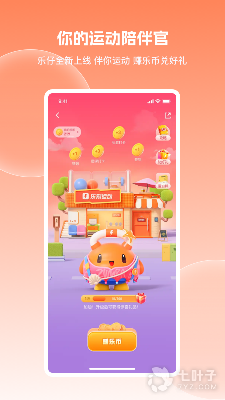 2、首页新增每日心情互动文案,下拉至二楼可找到你的运动陪伴官—小乐仔,伴你运动,还能赚乐币兑好礼。