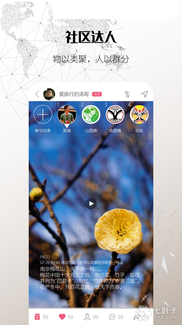 利用手机定位功能,将地理位置与地图坐标整合在一起。通过手机拍摄发布视频即可钉在对应的地图坐标上,将线上和线下更直观高效的联系在一起。