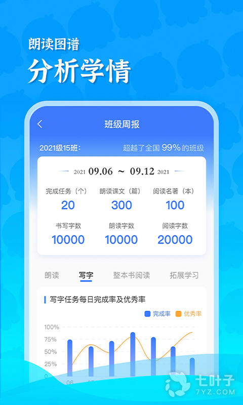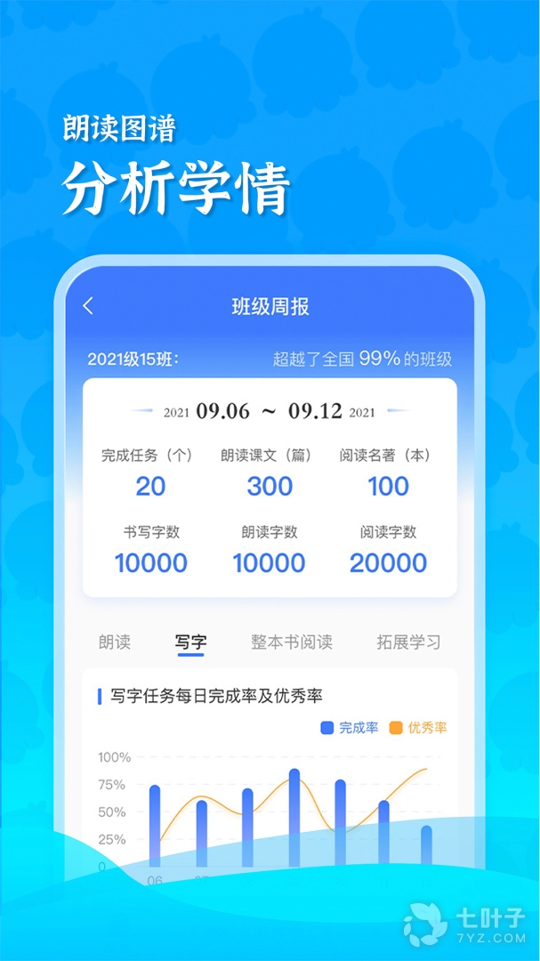 5.查看学生成绩:从准确度、流利度、清晰度对学生作品进行打分,并总结出高频错字,监测学生学习情况;老师可看到完成朗读任务学生的数量,如“40/45”即有5位同学未完成,可进行“一键提醒”。