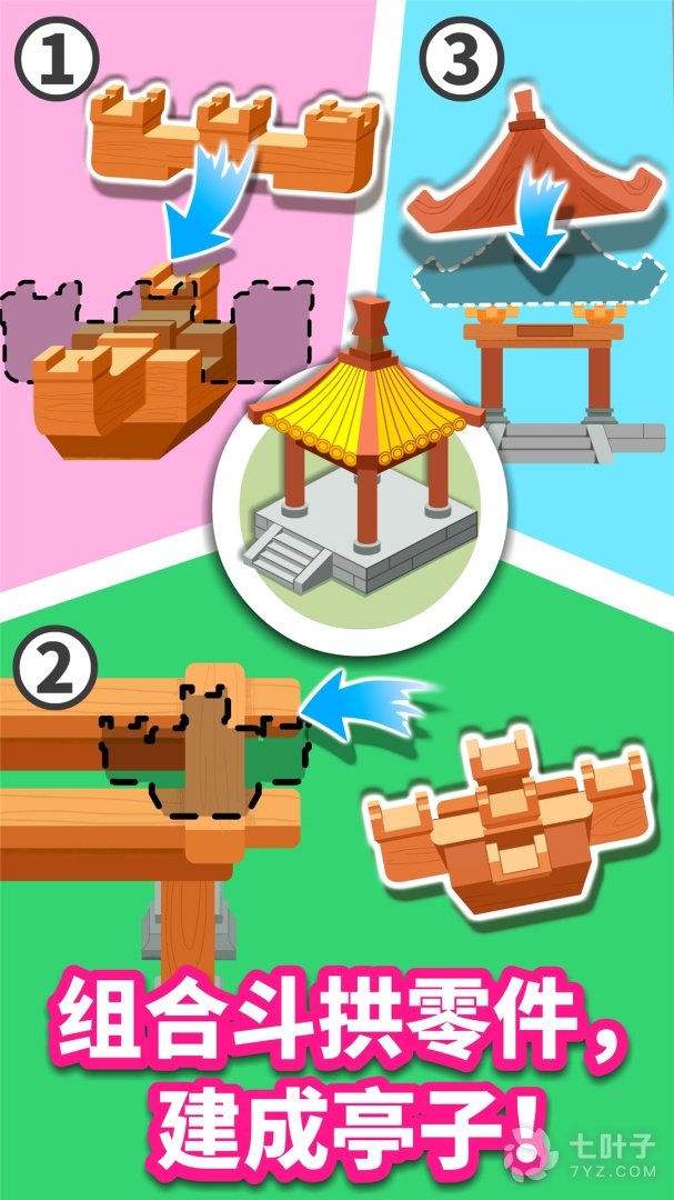 用零件组装斗拱,用来支撑房屋。斗拱可以通过位移和变形抵消部分地震能量!