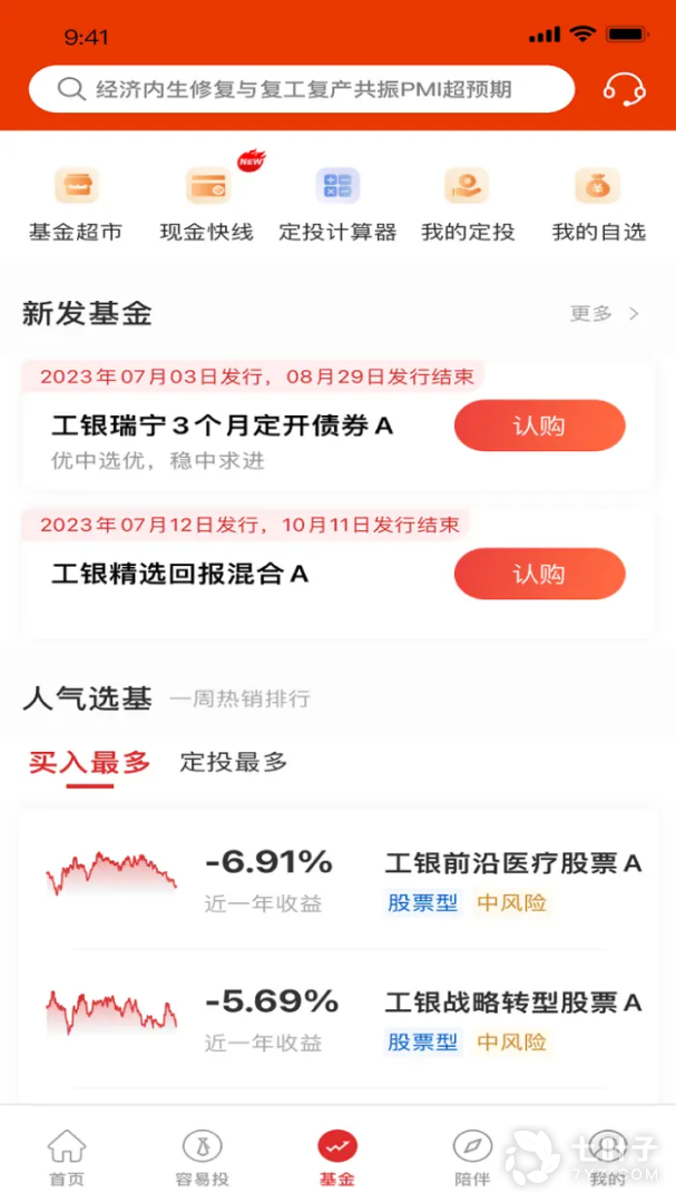 1、工行旗下的所有基金超市,给您全方位的选择。根据自身情况进行基金产品的认购和申请,每款基金还可查看净值和详情信息。