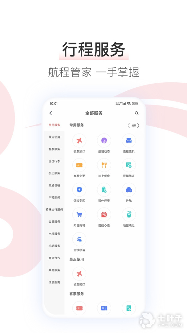2、中国国航App包含有出行管家,特价机票,办理乘机,航班动态,凤凰知音,自助改期等功能