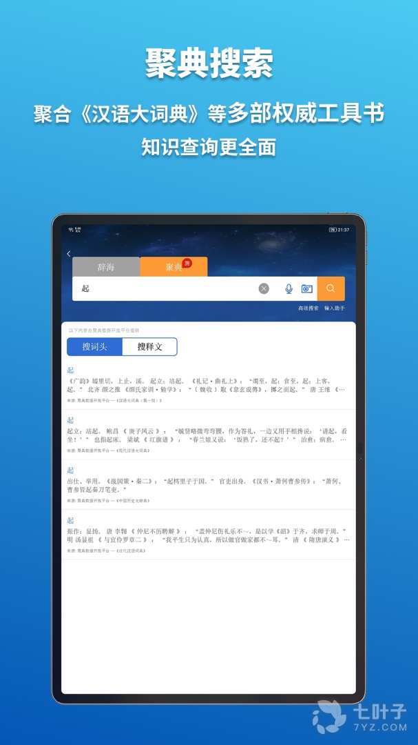 3、辞海HDapp收入了最全面的汉字,是非常不错的汉字字典工具,提供汉字解释、注释以及例句,还有汉字的演化过程,帮助大家更好的理解汉字,学习知识,还支持语音拍照搜索,方便又实用