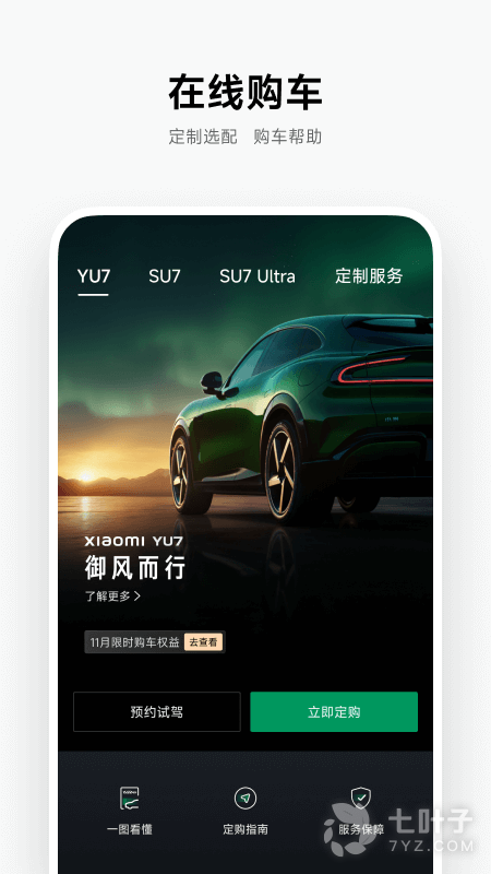 购车:了解小米汽车核心亮点和技术参数,可预约试驾、配置订购您的小米汽车,支持在线处理提车待办事项。