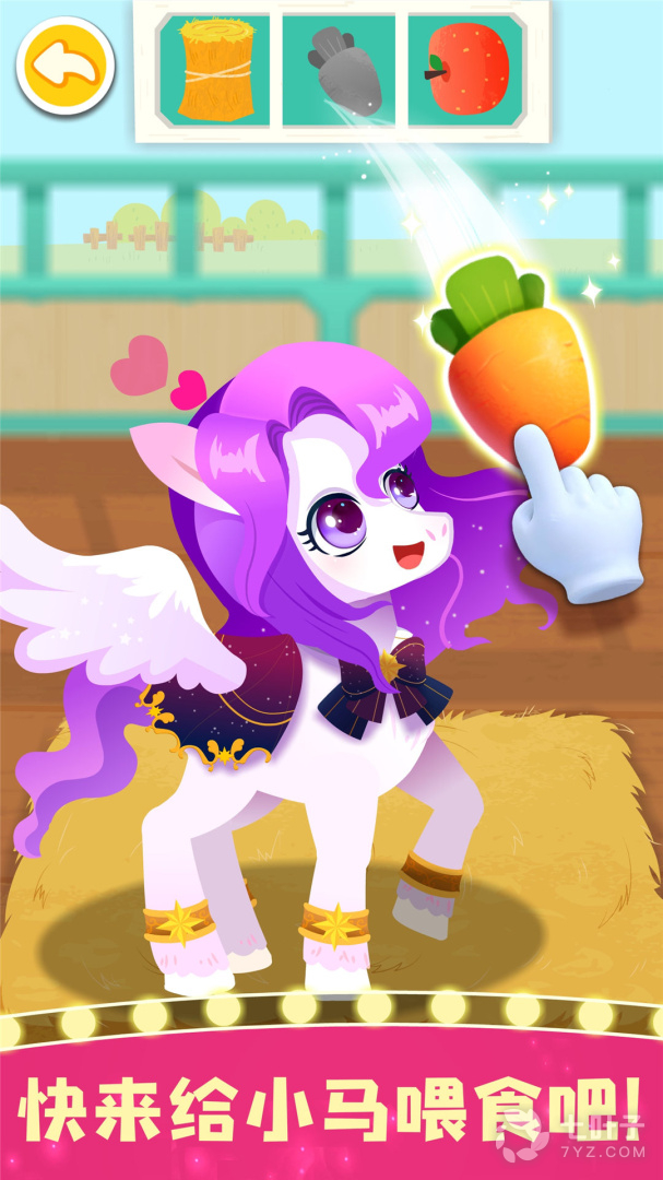 备赛的小马都吃什么呢?小麦饼干、青草蛋糕,远远不够哦。再去选购一些蔬菜水果吧:玉米、胡萝卜、苹果……营养丰富的食物搭配,才能让小马更强壮!