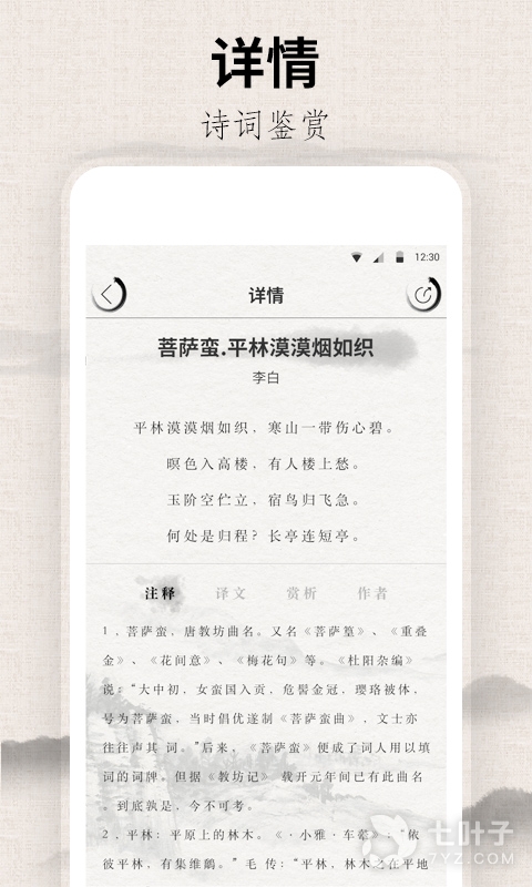 1、详情查看:详情页内容详尽,支持同步查看注解,译文和赏析