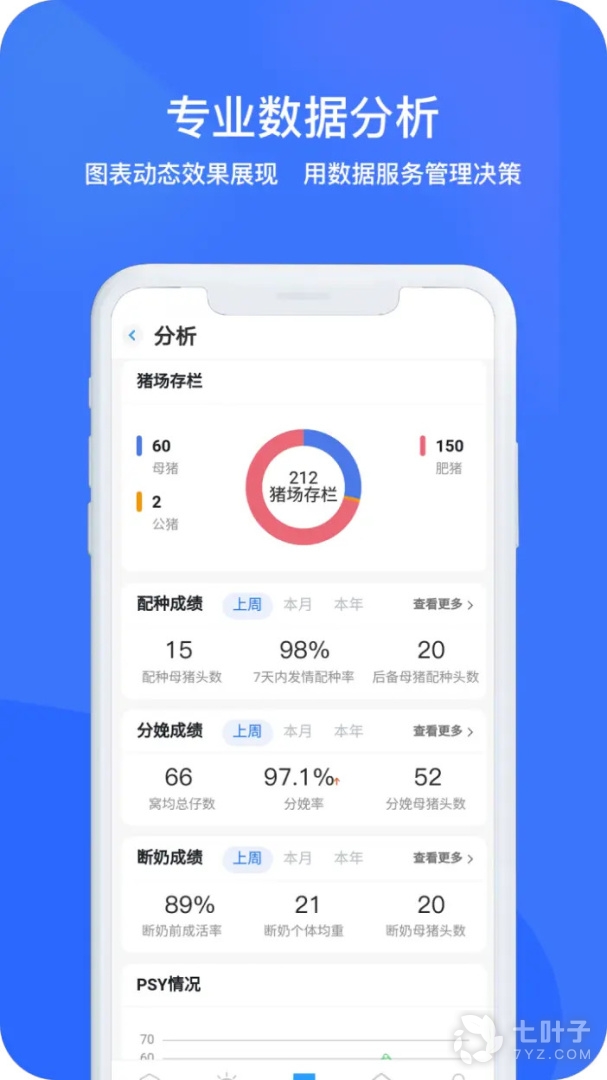 6、通过数据化管理,形成猪场的数据积累,自动生成数据分析报告,实时分析猪场绩效,横向分析全集团所有公司的生产指标、实时存栏、成本和销售业绩,为猪场制定解决方案提供有效的数据决策依据