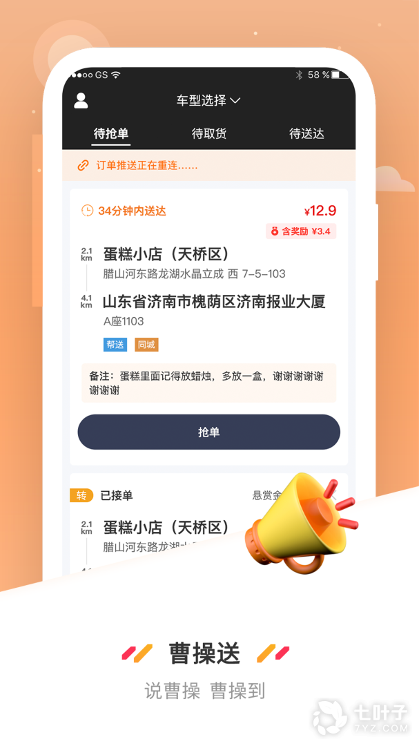 2、曹操送骑手App,是山东曹操送电子商务有限公司为骑手们打造的接单助手,首先您需要在此注册认证才能成为骑手,成为骑手后即可接单配送开展自己的业务啦