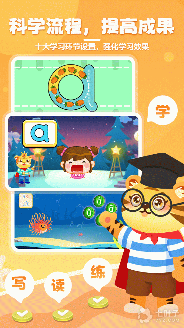 3、儿童学拼音是专为广大小孩子制作的拼音学习软件,软件通过图文和声音结合让宝宝加深记忆,并拥有考试功能,可以更好的激发孩子学习兴趣